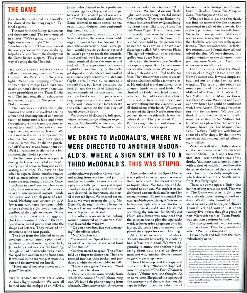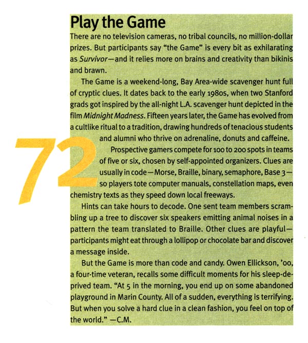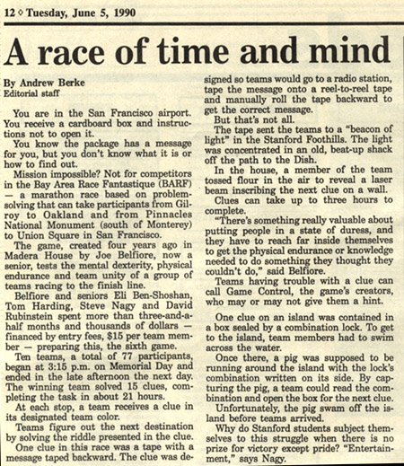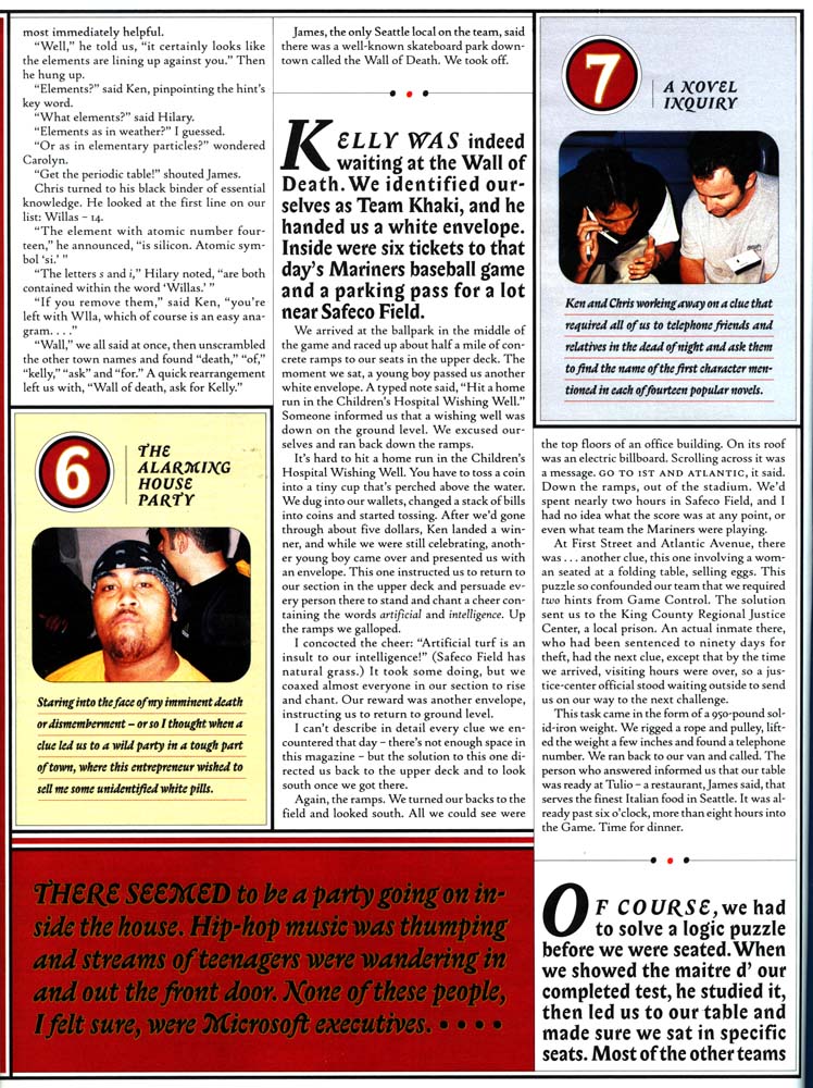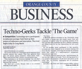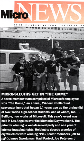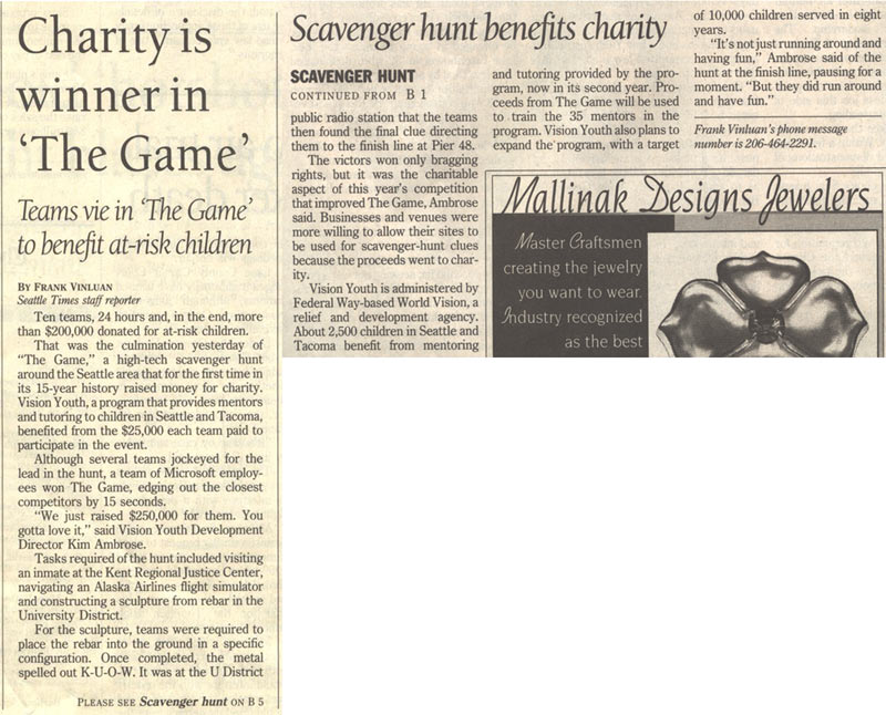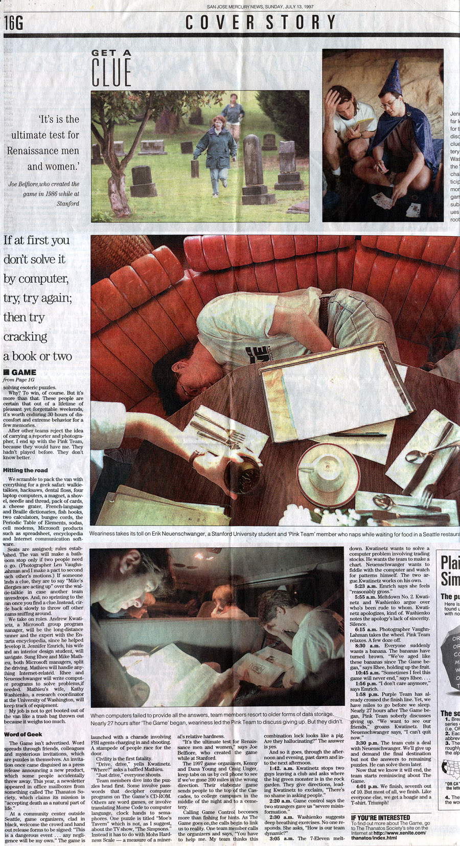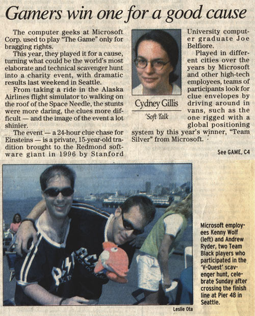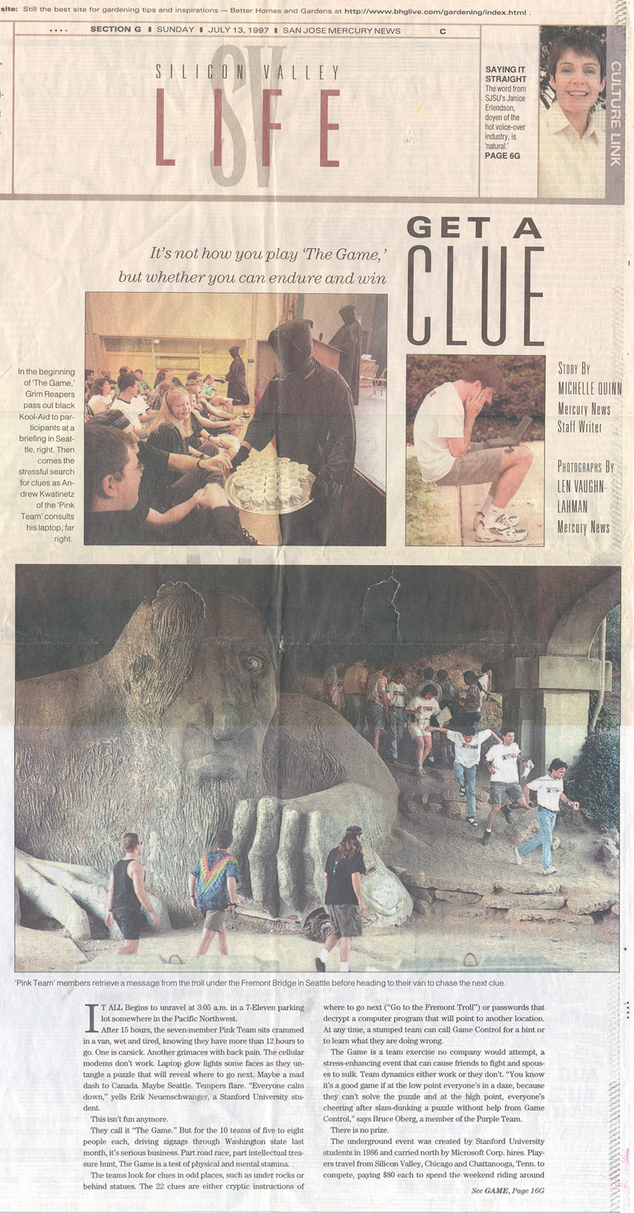 San Jose Mercury News - July 13, 1997 Michelle Quinn The Game got full front- and back-page coverage of their Silicon Valley Life section... and the ironic thing is that the event actually happened in SEATTLE and not in Silicon Valley! Lots of decent photos from the Game, but unfortunate they followed a team that came in 7th place out of 10....