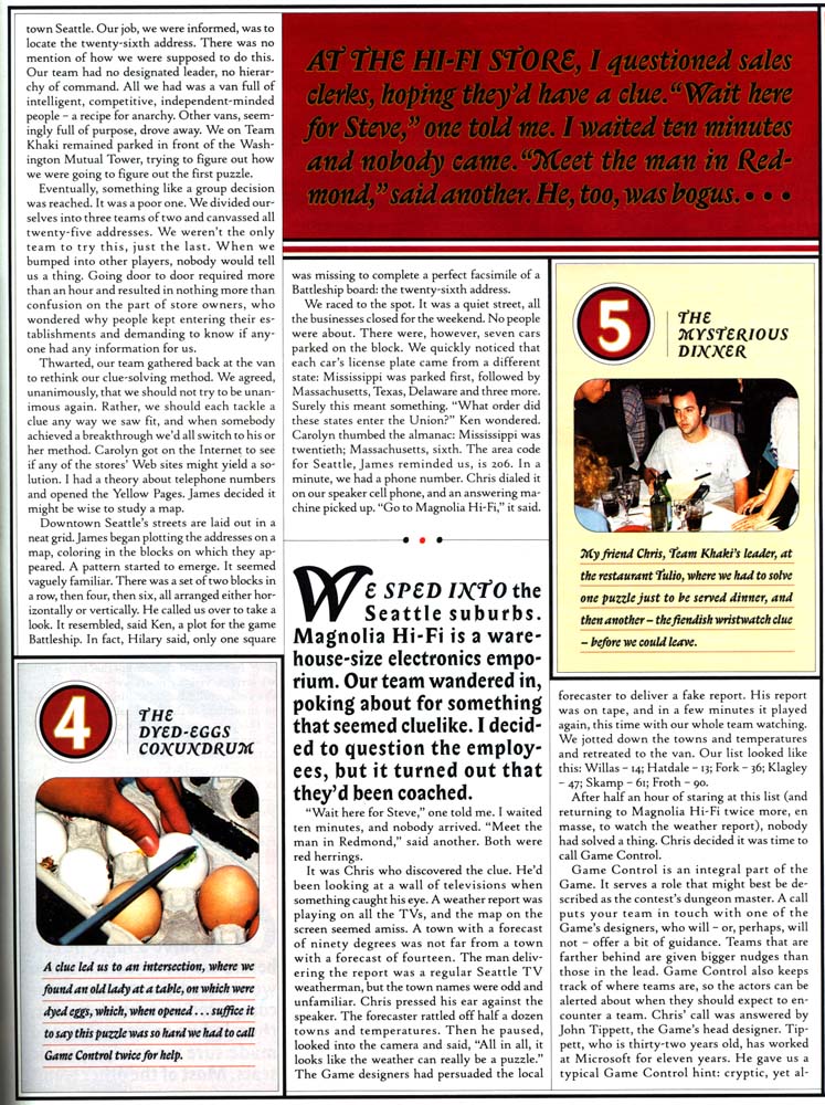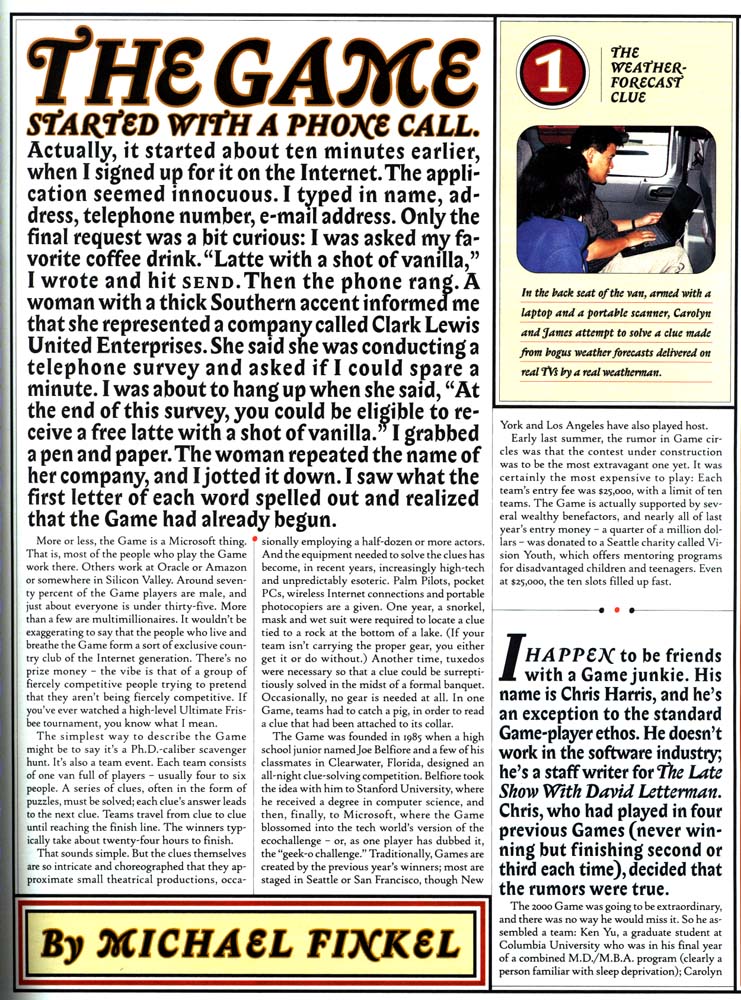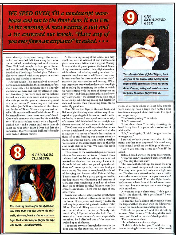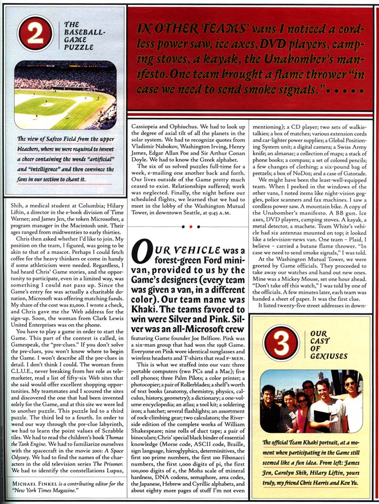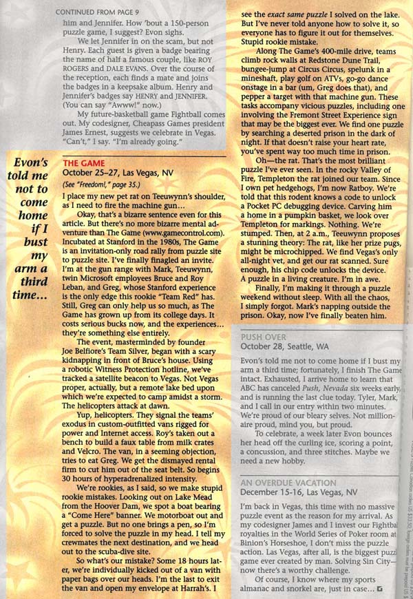 16, 2001 Mike Finkel A huge, comprehensive article describing Team Khaki's experience at VQuest 2000. Note: these are large scans of each page... ~280K each. |